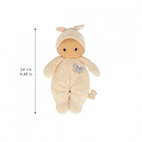 Descubre a Bebé Jasmine, una adorable muñequita rubia, de 24 cm de altura, de color crema y con unos preciosos ojos azules. Le gusta especialmente la flor de jazmín, símbolo de gracia, belleza y delicadeza. Su cuerpo es suave y blandito, y sus bracitos invitan a dar dulces abrazos. Una bonita mariposa adorna su torso, recordando la ligereza y la gracia de las flores. La etiqueta tejida con forma de mariposa es perfecta para invitar a los más pequeños a tocarla y así desarrollar su destreza. Está presente en todas nuestras tiernas bebés, como firma de la gama, como símbolo de conexión y singularidad.