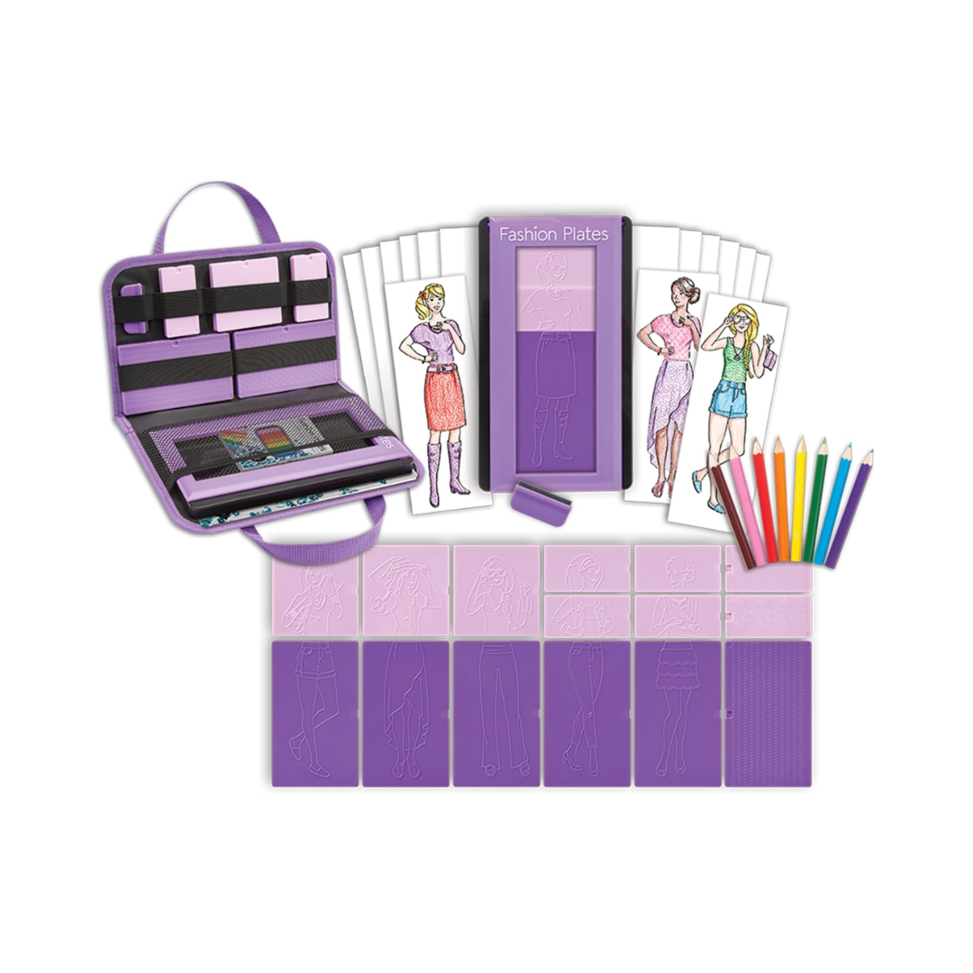 El set de diseño Fashion Plates Classic Styles facilita y hace divertido para los diseñadores principiantes la creación de sus propios diseños de moda fabulosos. Crea looks únicos combinando las diferentes placas de relieve en la tableta Fashion Plates. Con solo unas pocas pasadas del lápiz, tu diseño se transfiere al papel de dibujo. Añadir colores y detalles a tu nuevo look es muy sencillo con los lápices de artista incluidos y las texturas de moda integradas en la parte posterior de cada placa Fashion Plate. El elegante estuche tipo portafolio guarda ordenadamente tu tableta, placas y herramientas, ¡para que puedas llevar tus diseños y creaciones de moda a donde quieras!
